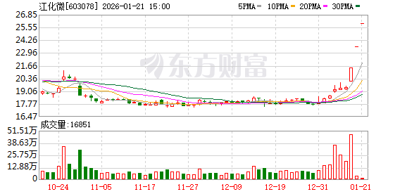 1月20日早盘,江化微(603078)开盘涨停,涨停板封单达到113.6万手,约合资金26.8亿元。