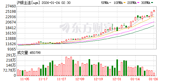 国内贵金属价格跟随大涨,沪金期货冲上1073元/克,年内累积涨幅已超8%;沪银期货日内最高冲上23690元/千克,20日晚夜盘高位回落,截至发稿报23009元/千克。