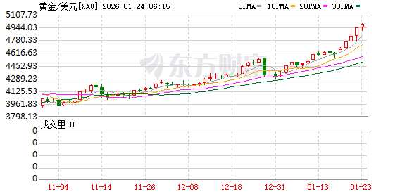 商品市场:国际油价01月23日上涨。截至当天收盘,纽约商品交易所WTI原油期货当月连续合约上涨1.92美元,收于每桶61.28美元,涨幅为3.23%。COMEX黄金期货当月连续合约上涨69.70美元,涨幅1.42%,报4983.1美元/盎司。COMEX白银期货当月连续合约上涨6.89美元,涨幅7.15%,报103.26美元/盎司。现货黄金上涨52.23美元,涨幅1.06%,报4988.6美元/盎司。现货白银上涨7.02美元,涨幅7.30%,报103.2美元/盎司。