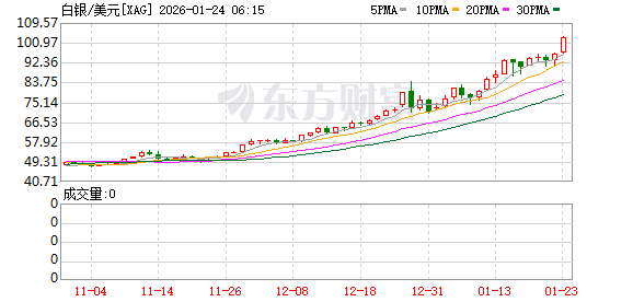 在避险资产需求激增、全球各地散户疯狂买入推动下,现货白银价格历史性地突破了每盎司100美元大关,延续了近期的炽热涨势。周五(1月23日)纽约时段,现货白银升破100美元,最高时涨4.5%报每盎司100.58美元。年初至今银价已累涨逾40%,在2025年银价已实现了近148%的年度涨幅。