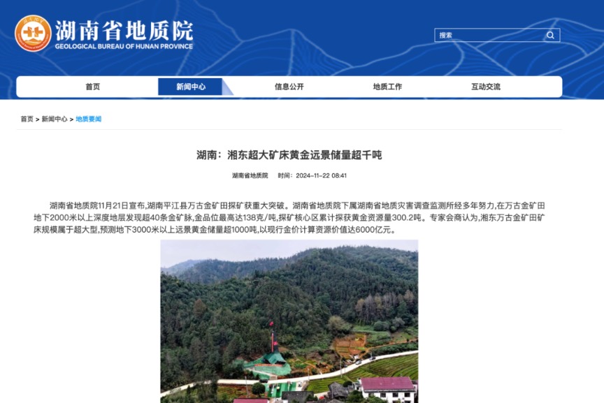 针对万古矿区,2024年11月,湖南黄金公告回应称,“预测地下3000米以上远景黄金储量超1000吨”为以前年度科研深孔见矿情况结合上部探明的资源分布状况推测的远景资源量(含探矿核心区累计探获黄金资源量300.2吨),后续仍需进行系统的地质勘探工作,最终探获的资源量存在一定的不确定性。受目前采矿工艺影响,后续该部分资源能否开采及何时开采均存在不确定性。