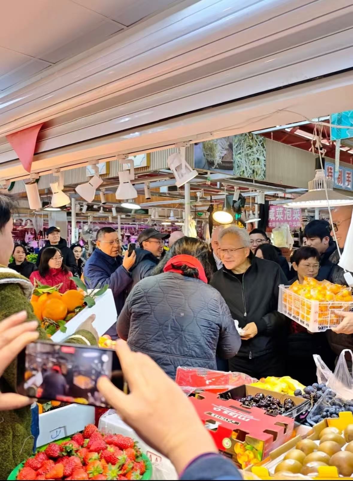 24日,黄仁勋还现身陆家嘴街道乳山路锦德菜市场,体验上海市井风俗。