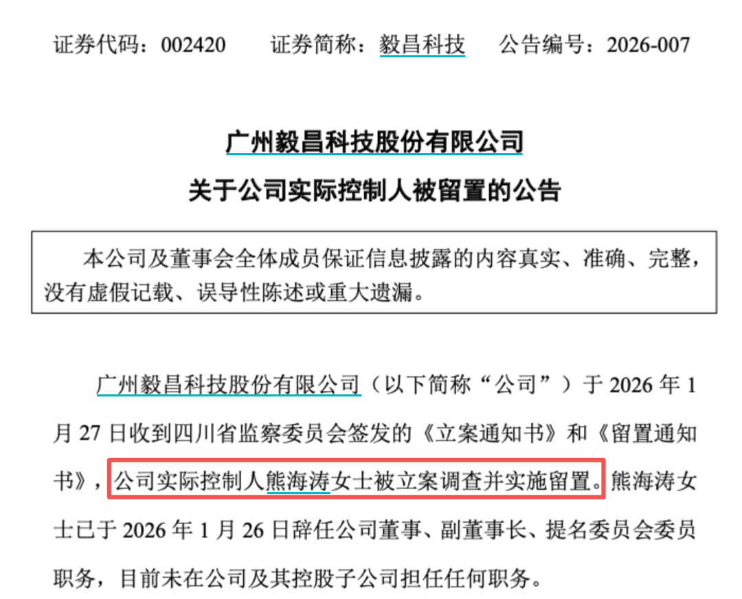 1月27日晚间,毅昌科技和高盟新材也双双发布公告称,实际控制人熊海涛因涉嫌犯罪,被四川省监察委员会立案调查并实施留置。不过,熊海涛已于1月26日辞去毅昌科技董事、副董事长、提名委员会委员职务,目前未在该上市公司及其控股子公司担任任何职务。