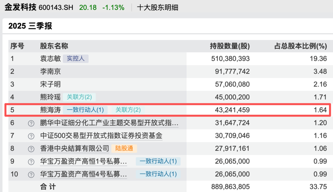 此外,熊海涛还是金发科技(600143)的第五大股东。进一步来看,金发科技实际控制人袁志敏与熊海涛曾有一段婚姻,该上市公司2015年年报披露,袁志敏与熊海涛系夫妻关系,但到了2016年半年报已不再显示双方有这层关系。近年来,袁志敏与熊海涛曾多次入围《胡润百富榜》,2024年10月,两人以410亿元财富位列《2024年·胡润百富榜》第125位。