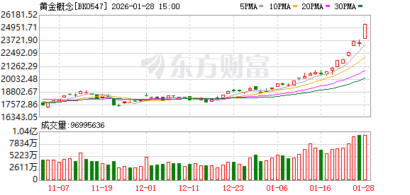 1月28日早盘,黄金概念股持续冲高,晓程科技、飞南资源20cm封板,中国黄金、招金黄金、豫光金铅等18股涨停,曼卡龙、迪阿股份涨逾15%。