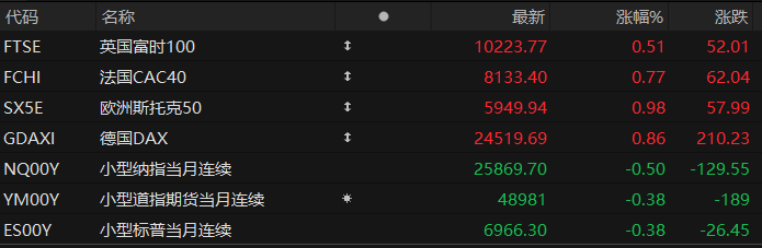 周五盘前,美股三大股指期货齐跌,欧洲主要指数普遍上涨。截至发稿,纳斯达克100指数期货跌0.50%,道指期货跌0.38%,标普500指数期货跌0.38%。