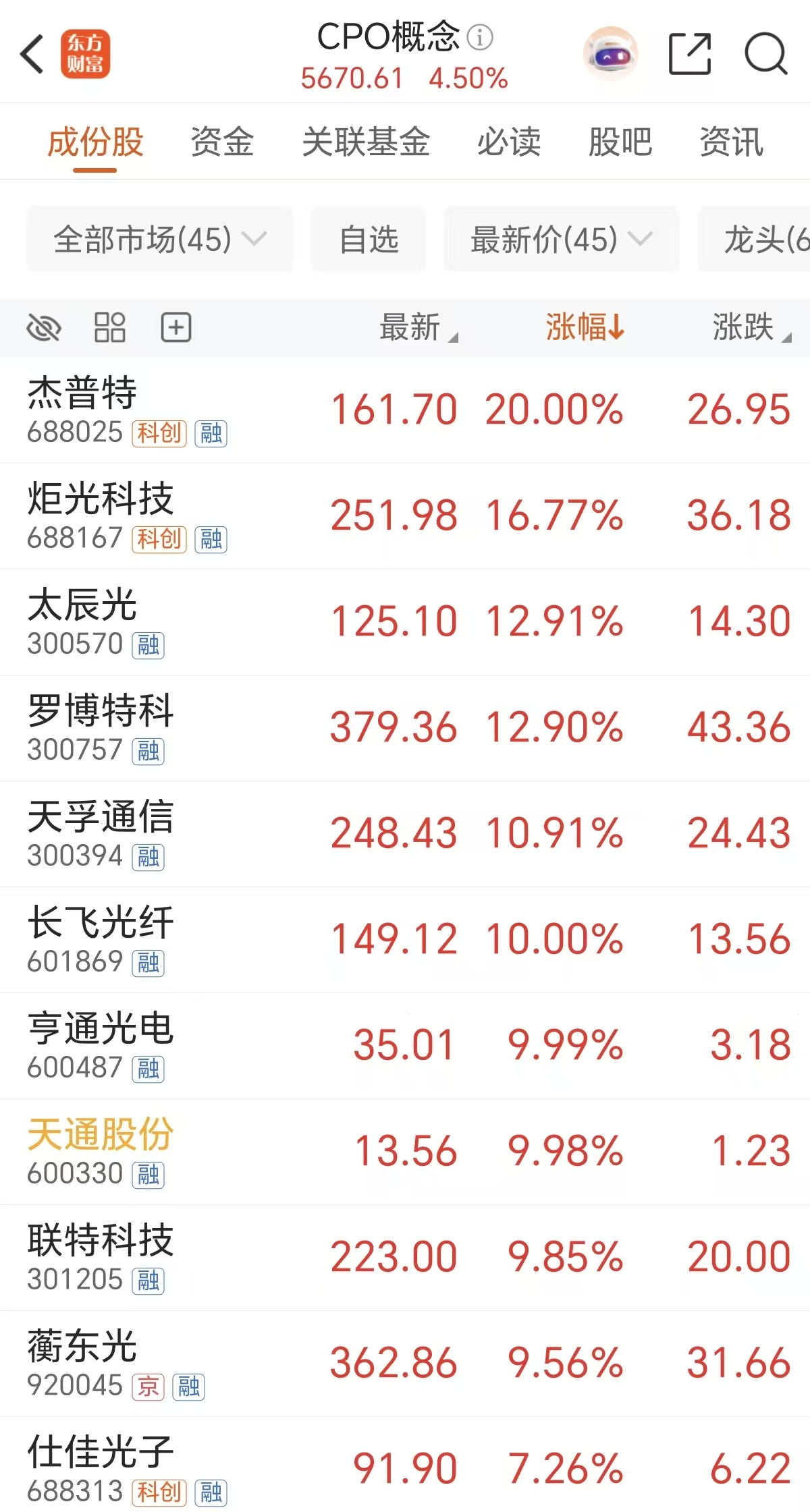 周五(1月30日)CPO概念大涨,杰普特20CM涨停,炬光科技、太辰光涨超10%,长飞光纤、亨通光电等多股涨停。