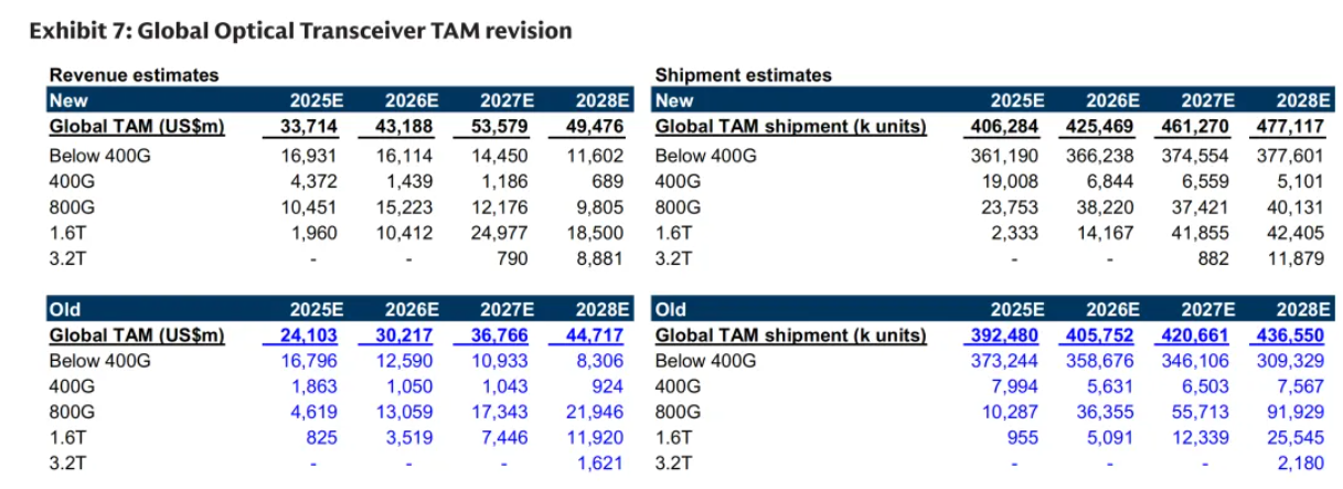 高盛研报表示,基于 AI 服务器预测更新、不同机型网络结构的进一步拆解,以及光模块供应商较 ODM AI 服务器交付时间提前一个季度的调整,高盛预计 2026/27 年全球光模块价值规模将分别提升 43%/46%,其中 800G/1.6T 光模块出货量将增至 3800 万 / 1400 万只(此前预估为 3600 万 / 500 万只)。高盛对全球光模块需求保持乐观,预计 2026-28 年 800G 及以上光模块出货量将以 34% 的复合年增长率增长,2028 年达 9400 万只。