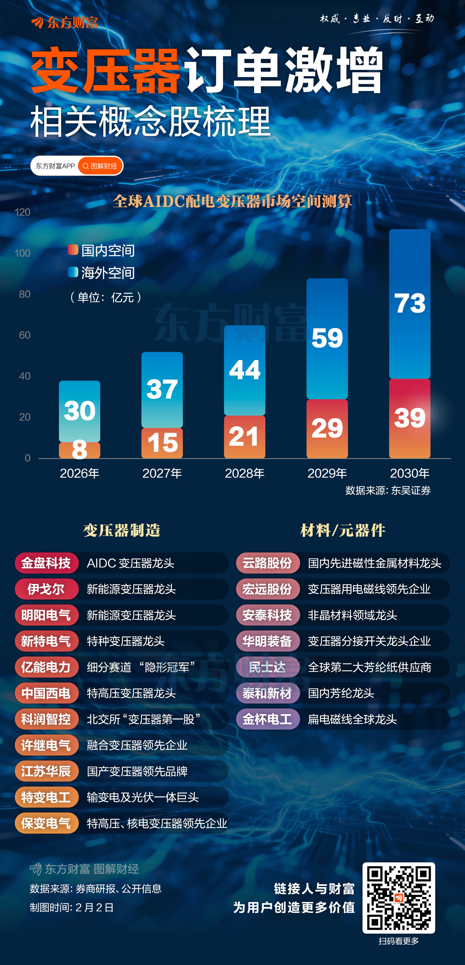 个股而言,变压器制造厂商(金盘科技、伊戈尔、中国西电、特变电工等)、相关材料元器件(云路股份、宏远股份、华明装备、金杯电工等)正受到市场较多关注。