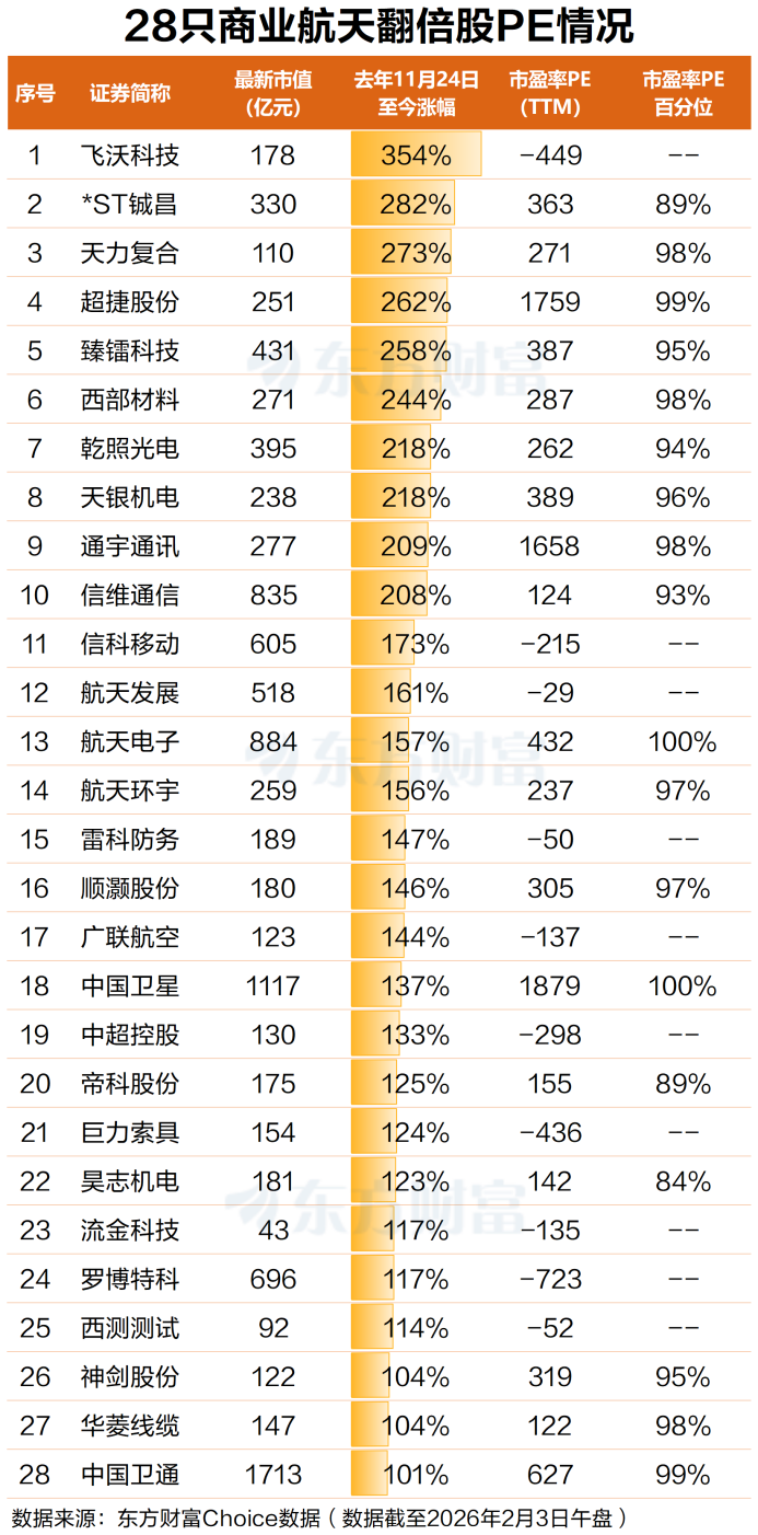 A股方面,据东方财富Choice数据,自2025年11月24日以来,商业航天概念持续活跃,截至 2026年2月3日午盘,商业航天概念期间累计涨幅达49%,成分股中有28股股价翻倍。不过,值得注意的是,该领域整体而言仍偏向概念和主题阶段,投资者需关注在快速上涨后,市场可能面临的波动加剧风险,以及未来基本面兑现的节奏,板块长期业绩兑现仍有待考证。