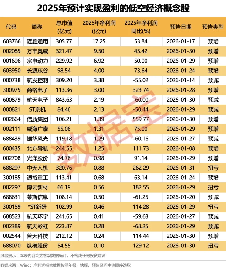 截至2月2日,已有44只低空经济概念股发布2025年业绩相关报告。以快报数据或预告中值统计,22家公司预计实现盈利。隆鑫通用、万丰奥威、宗申动力、长源东谷净利润规模居前,依次为17.25亿元、9.5亿元、6.92亿元、4亿元;航发控制和商络电子净利润规模均在3亿元及以上。