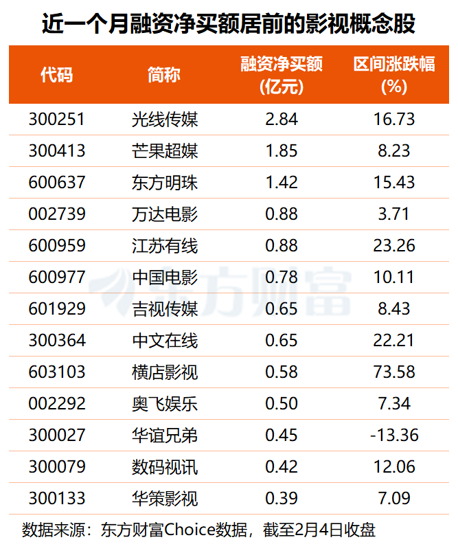 资金方面,近一个月共有22只影视概念股获得融资净买入,光线传媒获杠杆资金加仓2.84亿元,芒果超媒、东方明珠分别获融资客抢筹1.85亿和1.42亿元,万达电影、江苏有线、中国电影、吉视传媒、中文在线、横店影视的融资净买额均在5000万至9000万元之间。