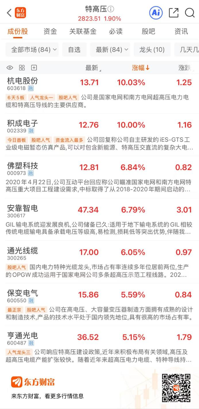 A股特高压概念继续活跃。2月6日,特高压概念低开高走,截至早间收盘,板块上涨1.90%,涨幅居市场前列。个股方面,杭电股份、积成电子涨停,佛塑科技、安靠智电、通光线缆涨超6%,保变电气、亨通光电涨超5%,中天科技、汇金通、汇源通信、中辰股份、汉缆股份、东方铁塔等涨超4%。