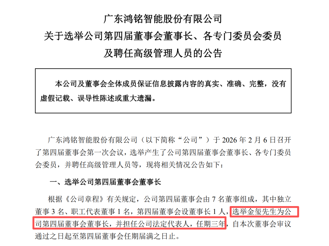 2月6日晚间,鸿铭股份(证券代码:301105)公告称,公司2月6日召开了第四届董事会第一次会议,选举产生了公司第四届董事会董事长、各专门委员会委员,并聘任高级管理人员等。其中,选举金玺为公司第四届董事会董事长,并担任公司法定代表人,任期三年。同时,聘任金玺为公司总经理,任期三年。