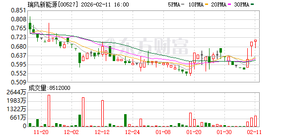 2月9日,瑞风新能源股价以0.62港元/股报收,大涨8.77%,最新市值为10.6亿港元。