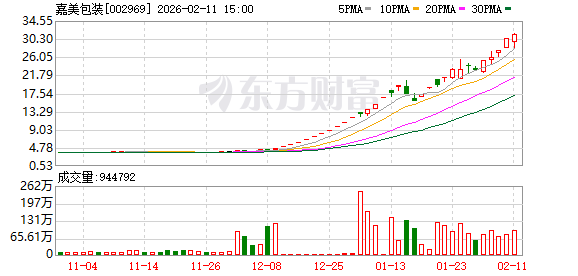 二级市场上,嘉美包装今日再度涨停,收获4天2板,最新股价报30.42元/股,总市值为333.53亿元。