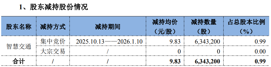 公告显示,捷顺科技上月也披露了股东减持情况。公司1月13日公告显示,截至2026年1月10日,公司持股5%以上股东深圳市特区建发智慧交通投资合伙企业(有限合伙)(以下简称“智慧交通”)原减持计划期限已届满,智慧交通向公司出具了《关于股份减持计划实施情况告知函》。自2025年10月13日至2026年1月10日,智慧交通通过集中竞价交易方式减持公司股份6,343,200股,占公司总股本的0.99%。通过公告所附表格(见下表)计算,智慧交通此次减持金额达6235万元。