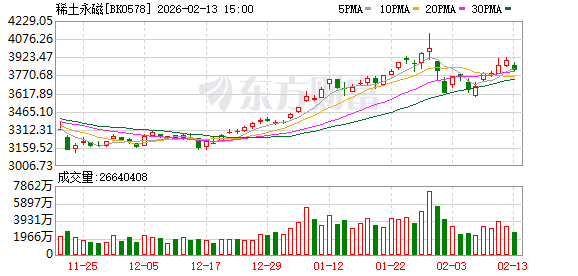 2月11日,A股稀土永磁板块领涨市场,中证稀土产业指数上涨2.5%,概念股中,北矿科技、格林美涨停,厦门钨业、北方稀土涨超5%,有研粉材、中矿资源、银河磁体、金力永磁、天和磁材等相关个股涨幅靠前。