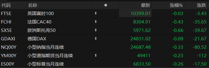 周五盘前,美股三大股指期货齐跌,欧洲主要指数普遍下跌。截至发稿,纳斯达克100指数期货跌0.33%,道指期货跌0.23%,标普500指数期货跌0.26%。