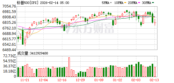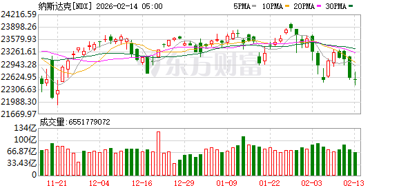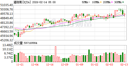 美股市场:美股三大指数02月13日收盘涨跌不一。截至收盘,道琼斯工业平均指数比前一交易日上涨48.95点,收于49500.93点,涨幅为0.1%;标准普尔500种股票指数上涨3.41点,收于6836.17点,涨幅为0.05%;纳斯达克综合指数下跌50.48点,收于22546.67点,跌幅为0.22%。本周,道指累跌1.23%,纳指累跌2.10%,标普500指数累跌1.39%。