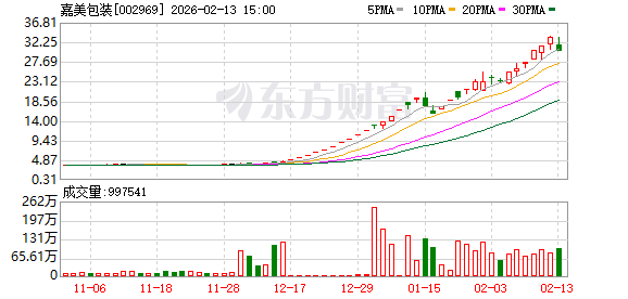 2月13日,嘉美包装的股价最终被封死在跌停板上,而此前该股常常“连续涨停”。截至当日收盘,公司股价报30.05元/股。