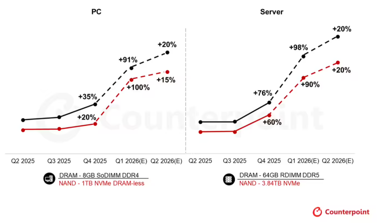 消息方面,据近日Counterpoint发布的《2月内存价格追踪报告》,截至2026年第一季度,内存价格环比上涨80%—90%,本轮上涨的主要推手是通用服务器DRAM价格大幅攀升。以服务器级内存为例,64GB RDIMM合约价已从去年第四季度的450美元,飙升至第一季度的900美元以上,且二季度有望突破1000美元关口。