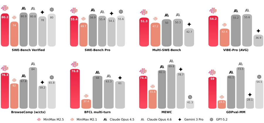 在编程最硬核的SWE-Bench Verified榜单上,M2.5拿到了80.2%的高分,与Claude Opus 4.6仅有微弱差距。在多语言任务Multi-SWE-Bench上,M2.5超越Claude Opus 4.6拿到第一。