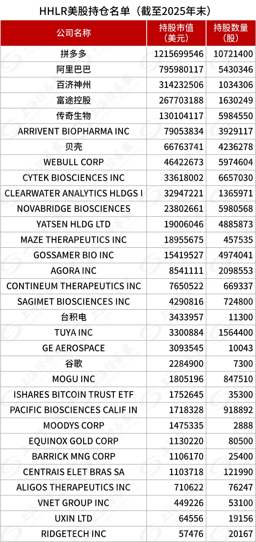 数据显示,截至2025年末,HHLR共持有33只美股上市公司,中概股仍是其核心配置资产。从调仓动作来看,HHLR去年显著增持了阿里巴巴和拼多多,减持网易、富途控股等标的,持仓进一步集中在电商龙头、生物医药和科技方向。