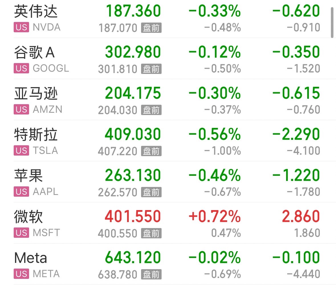 大型科技股多数下跌,英伟达、谷歌、亚马逊、特斯拉、苹果、Meta微跌,微软上涨0.72%。