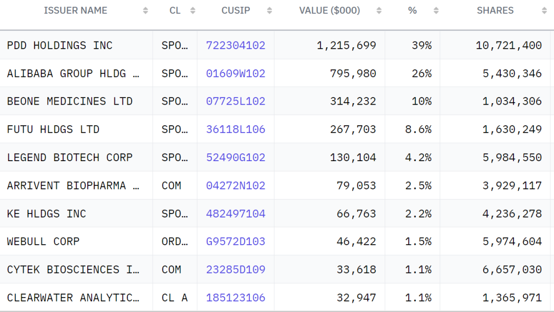 具体来看,HHLR Advisors前十大重仓股分别为拼多多、阿里巴巴、百济神州、富途控股、传奇生物、ARRIVENT BIOPHARMA INC、贝壳、WEBULL CORP、CYTEK BIOSCIENCES INC和CLEARWATER ANALYTICS HLDGS I。