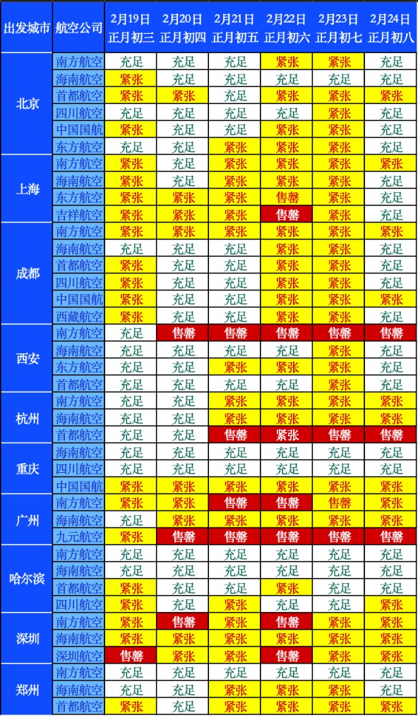 值得关注的是,未来几天,海南出岛将迎返程高峰,三亚返回多地的机票已出现紧张态势。据三亚凤凰国际机场发布的消息,截至2月18日,出港方面,2月19日-24日,三亚前往杭州、上海、广州、深圳方向的机票余量较为紧张,前往北京、西安、郑州、成都等地的余票紧张程度次之。