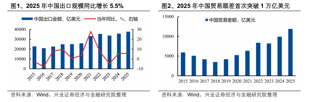 2025年在复杂外部环境下,中国外贸持续超预期,展现出强劲韧性。2025年面对全球经济复苏疲软以及关税摩擦升级等诸多不利因素,中国出口总额来到历史新高,同比增长5.5%。同期,中国贸易顺差首次突破1万亿美元,同比大幅上升19.8%。