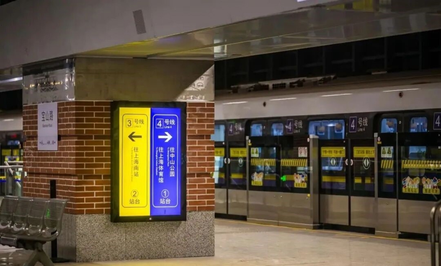 申通地铁相关负责人介绍,为方便乘客辨识,站台中央设置了面向两侧站台门的一体化导向牌,整合了站名、线路图、方向图以及出口、无障碍设施等信息。此外,新增站台的楼扶梯口处还增设了墙面灯箱,清晰指引3号线与4号线的乘车方向。