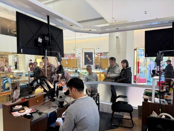 记者在现场看到,不少消费者刚进店门,就被这间定制工坊牢牢吸引。有人驻足玻璃围挡前,好奇地向内张望;有人紧盯显示屏,目不转睛地观赏工匠们的精工细作。老凤祥国家级非遗技艺金银细工第七代传承人、上海美术家协会会员周天应介绍,老凤祥11位非遗传承人将轮流进驻工坊,现场演示金工技艺。