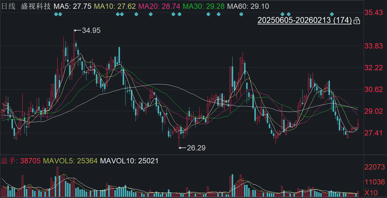 二级市场上,截至2月13日收盘,盛视科技上涨1.19%报28.06元/股,总市值约73.48亿元,近一年以来累计下跌约16%。