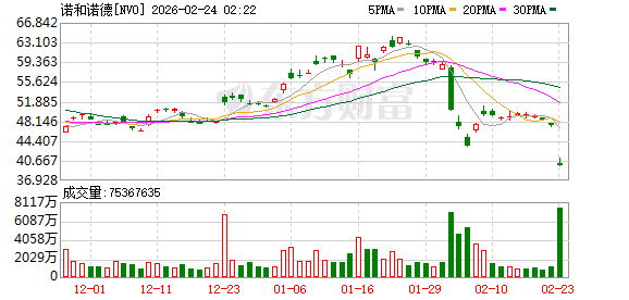减肥药巨头诺和诺德盘中跌近15%。消息面上,该公司宣布其新一代减重药物未能达到关键目标—— 证明其效果不劣于礼来的竞品。诺和诺德在周一早间声明中表示,在84周治疗后,其药物CagriSema未能达成与礼来替尔泊肽(tirzepatide)对比减重效果非劣效的主要终点。