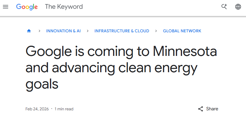周二(2月24日),谷歌在官网宣布,公司将在美国明尼苏达州建设一个新的数据中心,并与当地的公用事业公司Xcel Energy合作,加速创新能源解决方案的实施。