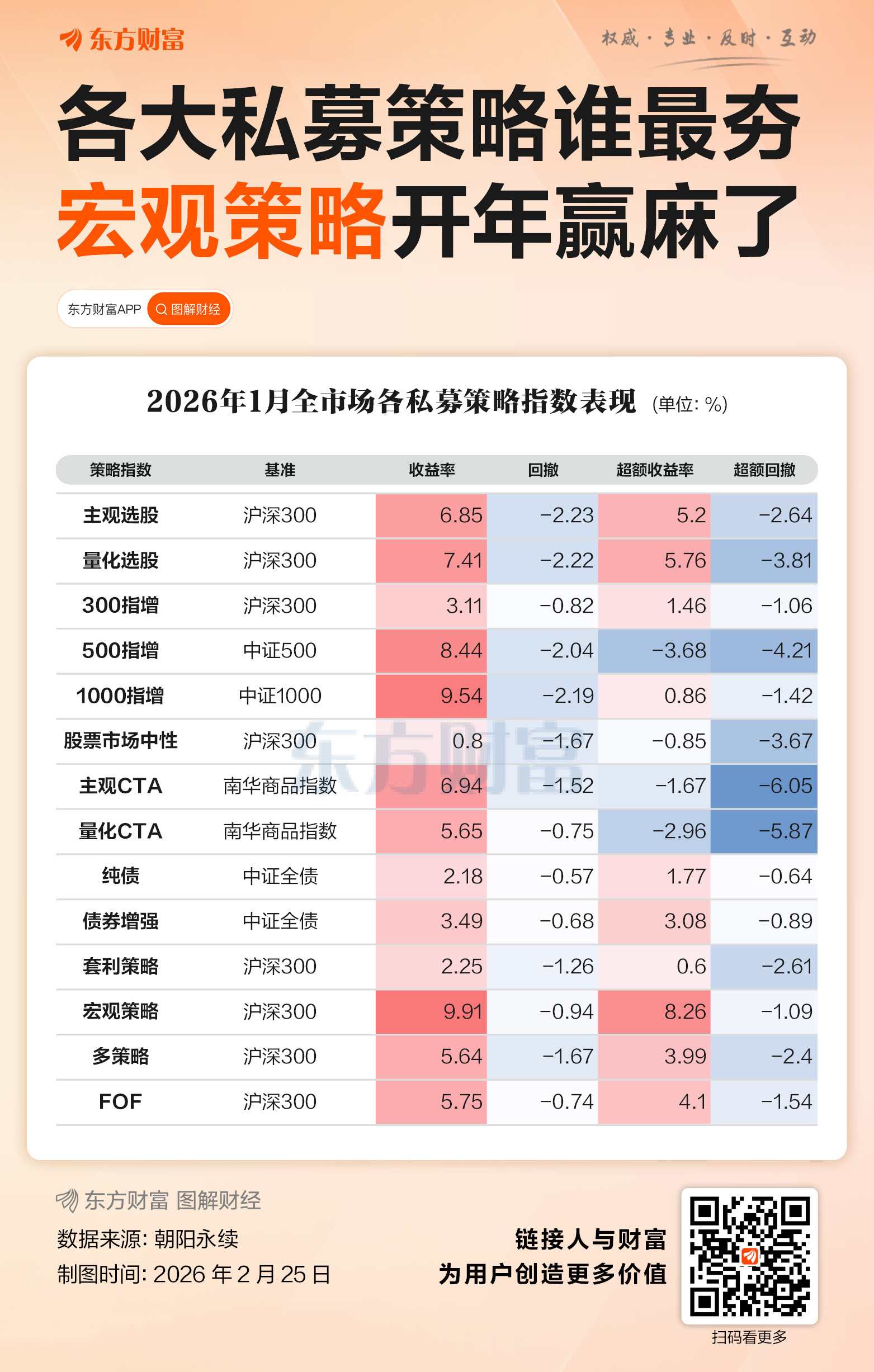 具体而言,在2026年1月,沪深300的基准收益率为1.25%,宏观策略超额收益以8.26%位列第一;量化选股收益率7.41%,超额收益5.76%;主观选股收益率6.85%,超额收益5.2%。