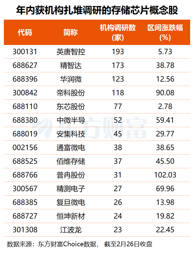 2026年以来,存储芯片概念股平均上涨近24%,其中,普冉股份股价翻倍,帝科股份累涨90%,恒烁股份、江丰电子均涨近八成,精测电子、德龙激光、中微半导等6股涨幅均在50%以上。