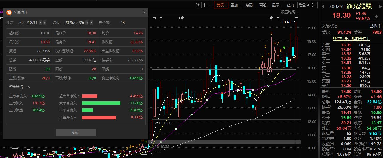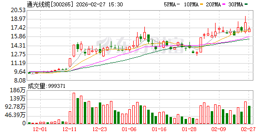 东方财富数据显示,就在减持公告发布的同日(2月26日),通光线缆股价在二级市场迎来大涨,盘中一度涨15.26%,最终收盘报18.30元/股,单日涨幅达8.67%。大股东和高管在板块及个股情绪双双走高时抛出减持计划,节点特征较为明显。
