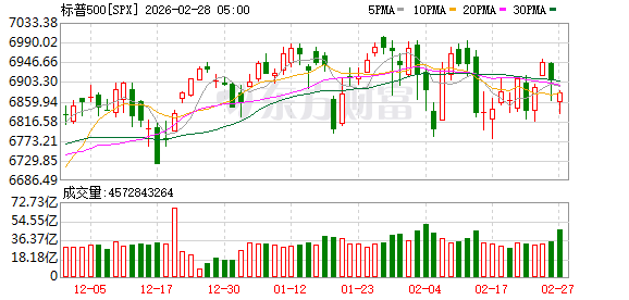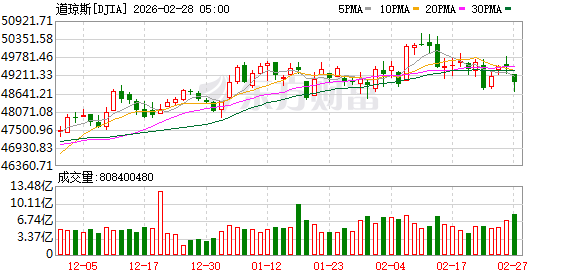 美股市场:美股三大指数02月27日收盘全线下跌。截至收盘,道琼斯工业平均指数比前一交易日下跌521.28点,收于48977.92点,跌幅为1.05%;标准普尔500种股票指数下跌29.98点,收于6878.88点,跌幅为0.43%;纳斯达克综合指数下跌210.17点,收于22668.21点,跌幅为0.92%。