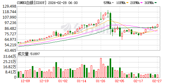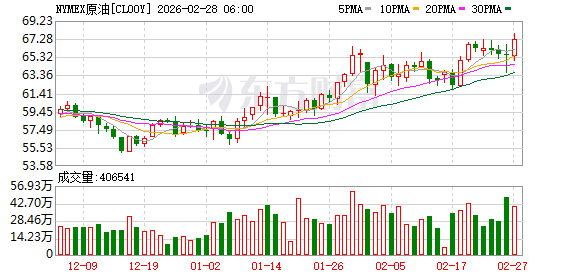 商品市场:国际油价02月27日上涨。截至当天收盘,纽约商品交易所WTI原油期货当月连续合约上涨2.08美元,收于每桶67.29美元,涨幅为3.19%。COMEX黄金期货当月连续合约上涨102.20美元,涨幅1.97%,报5296.4美元/盎司。COMEX白银期货当月连续合约上涨6.80美元,涨幅7.77%,报94.385美元/盎司。现货黄金上涨93.93美元,涨幅1.81%,报5279.22美元/盎司。现货白银上涨5.46美元,涨幅6.18%,报93.76美元/盎司。