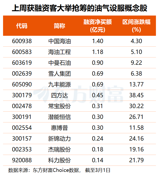 资金方面,东方财富Choice数据显示,上周共22只油气设服概念股获得融资净买入,中国海油、海油工程分别获融资客抢筹1.40亿和1.18亿元,中曼石油获杠杆资金加仓约9000万元,雪人集团、九丰能源、潜能恒信等5股融资净买额均在3000万至7000万元之间。