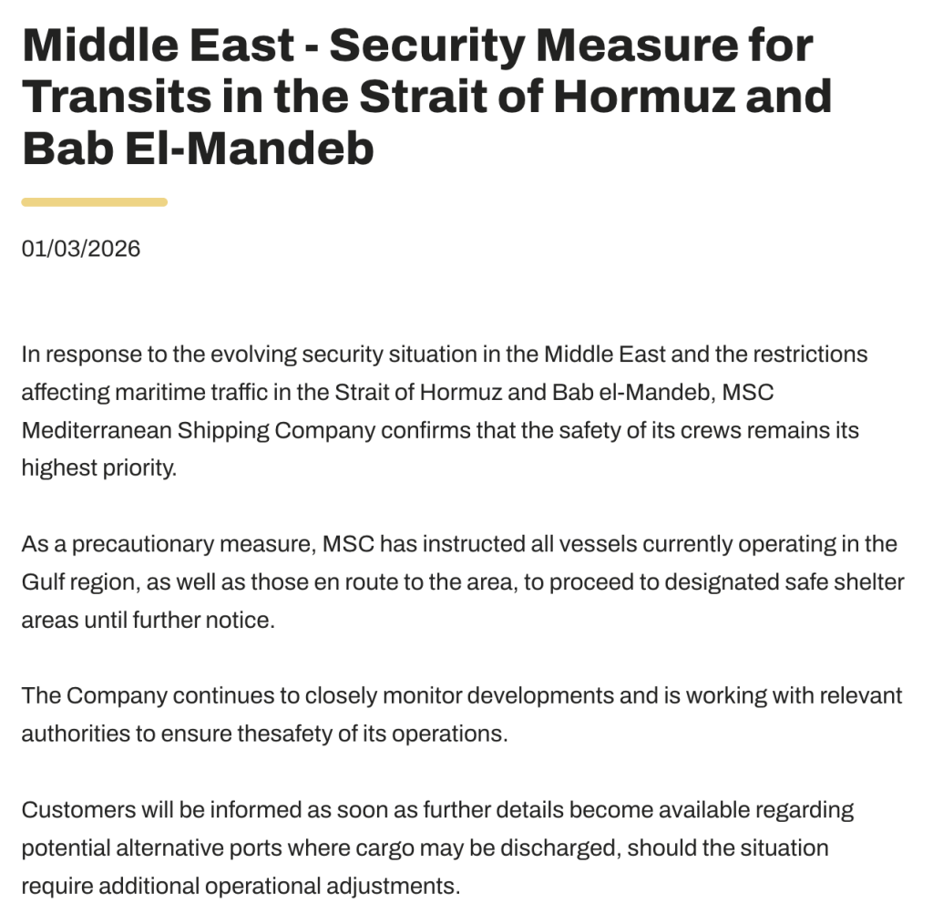 据记者梳理,全球运力第一的航运企业地中海航运公司(MSC)当地时间3月1日在官网发布公告称,鉴于中东地区安全局势不断变化,以及霍尔木兹海峡和曼德海峡海上交通受到限制,MSC已指示所有目前在海峡地区运营的船舶以及正在前往该地区的船舶驶往指定的安全避风区域,直至另行通知。