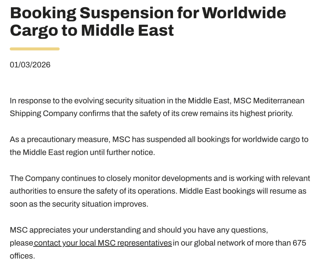 此外,3月1日地中海航运公司还发布公告称,鉴于中东地区安全形势不断变化,MSC已暂停所有全球范围内前往中东地区的货物预订,直至另行通知。公司将继续密切关注事态发展,并与相关部门合作,以确保运营安全。一旦安全形势好转,公司将立即恢复中东地区的货物预订。