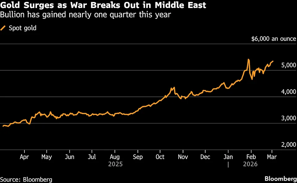 金价在早盘交易中一度上涨超过2%,达到每盎司约5390美元,此前一周已上涨超过3%,原因是美军在该地区集结兵力。周末,美国和以色列袭击伊朗后,冲突进一步蔓延,德黑兰随即向多个国家的目标发射了多枚导弹作为回应。伊朗最高领袖哈梅内伊在空袭首日身亡。