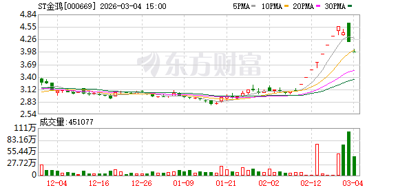 油气开采、能源设备板块普涨行情下,八连板“妖股”ST金鸿(000669.SZ)终止上涨态势。3月3日,主营天然气综合利用业务的ST金鸿早盘涨停,后股价跳水触及跌停,上演“天地板”。