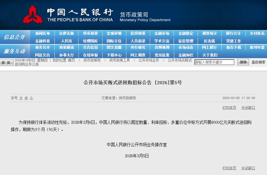 中国人民银行3月5日发布公告称,为保持银行体系流动性充裕,2026年3月6日,将以固定数量、利率招标、多重价位中标方式开展8000亿元买断式逆回购操作,期限为3个月(91天)。