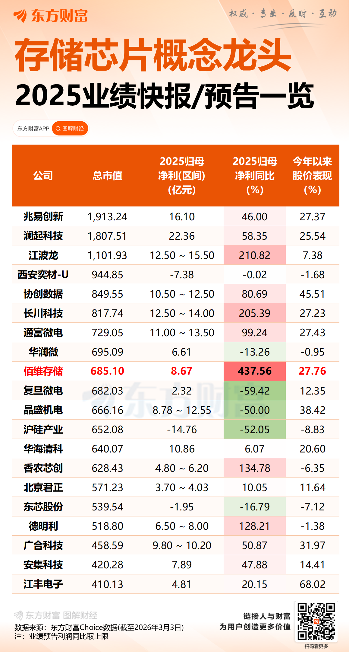国内存储芯片龙头佰维存储公告称,公司2025年实现营收112.96亿元,同比增长68.72%;归母净利润为8.67亿元,同比增长437.56%。预计2026年1-2月实现营收40亿至45亿元,同比增长340%至395%;归母净利润为15亿至18亿元,同比扭亏为盈。