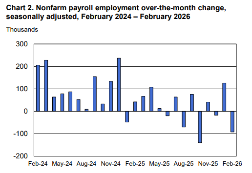 具体数据显示,美国2月环比减少了9.2万个非农就业岗位,市场原先预期会增加5.9万个,1月数据也从13万个下修至12.6万个。上一次非农出现这么大跌幅是在去年10月,当时减少了14万个。